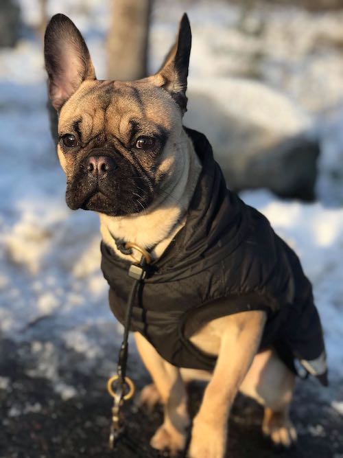 Mollie (Mops/Fransk bulldog) ute på promenad i solen.