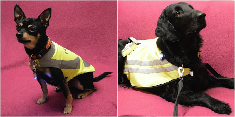 Så ett varmt tips från Changdobels är att synas väl, hällre för synlig än att inte synas alls! Här ser vi två fina fotomodeller, Simba (dv.pinscher blandras) och Ralph (flatcoated retriever) som visar upp lite av vårat utbud.